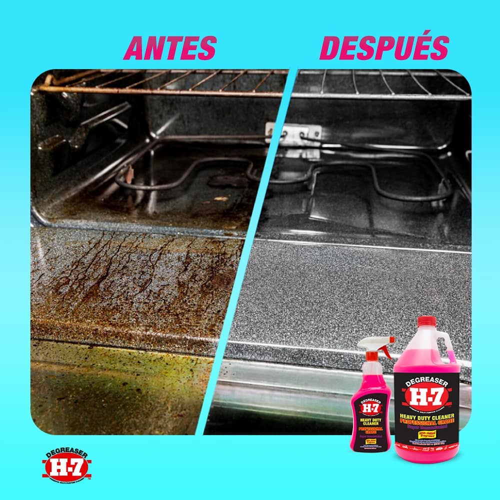 Es tu aliado perfecto para combatir la grasa en la cocina. Su fórmula avanzada elimina de manera rápida y eficiente los residuos de aceite, grasa y suciedad en estufas, campanas extractoras, encimeras y utensilios. Con H-7, no tendrás que frotar ni esforzarte, ya que disuelve la grasa en minutos, dejando tus superficies limpias, sin restos ni residuos. Ideal para mantener tu cocina impecable, ¡sin esfuerzo y con resultados profesionales!