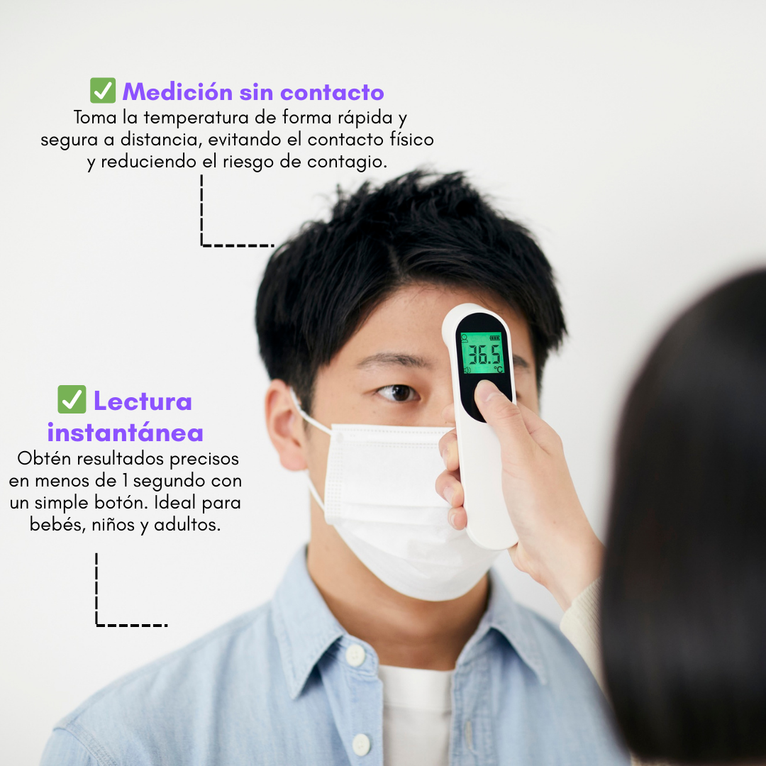 Mide la temperatura sin necesidad de tocar la piel, ideal para prevenir contagios, Perfecto para uso familiar, en negocios o entornos escolares. ✨