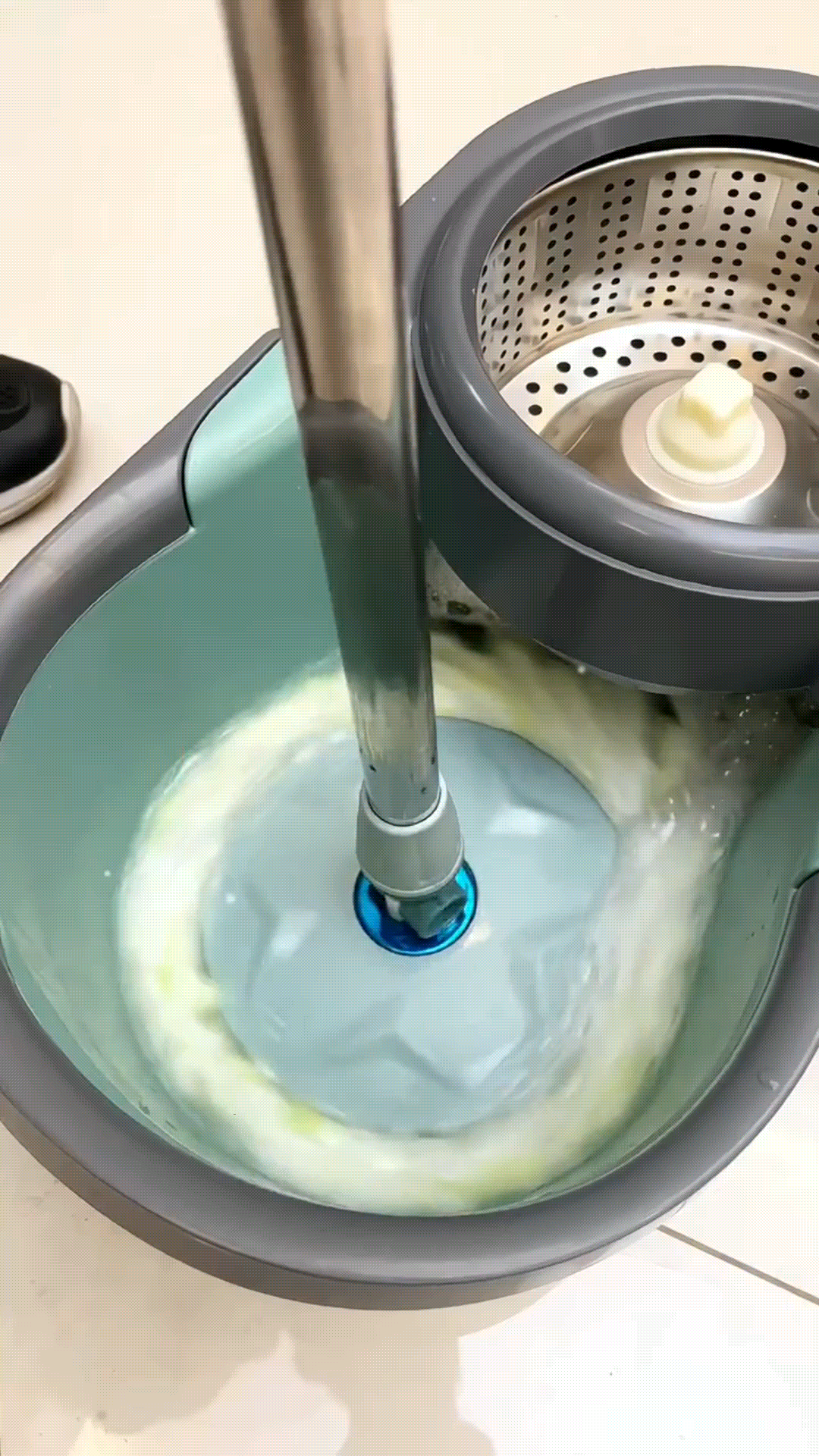 presiona el trapeador sobre la cubeta giratoria y ésta hará el resto del trabajo.
